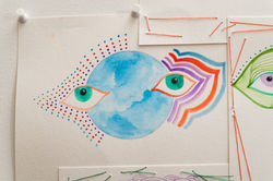 ![]() 108 community prayers stitched together creating a collective prayer for hope. [detail] 6' 4"H X 6' 3" W Watercolor on paper June 22, 2020 | ![]() Response to Covid-19 2020 first 10 out of 108 Eyes with Intentions Watercolor on paper stitched together 2020 | ![]() #1 “Love for all” -Cydney Williams 6”H X 6”W Watercolor on paper April 2, 2020 |
